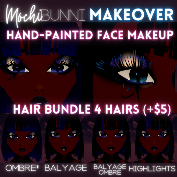 Come get a.. MochiBunni MakeOver! These makeovers are are hand-painted and custom-made to your liking using Photoshop and Gimp. I can't wait to let you feel more like you in your own avatar with your custom look! Makeovers will be recorded for a timelapse and will be posted on YouTube! If you do not want to be featured, please let me know!